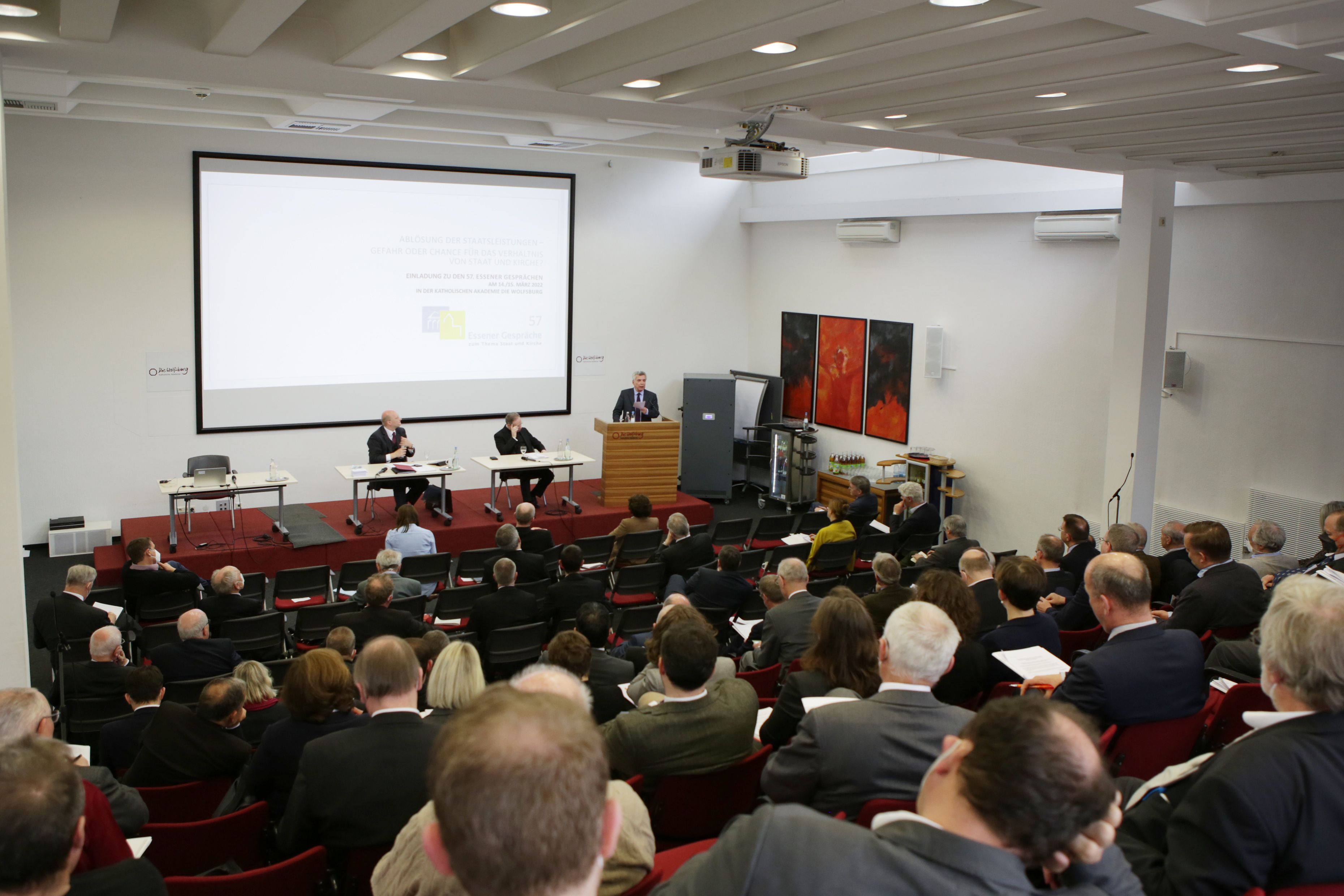 INFO: Die Essener Gespräche zum Thema Staat und Kirche Die Essener Gespräche zum Thema Staat und Kirche haben sich seit ihren Anfängen 1966 zu einem europaweit anerkannten überkonfessionell und interdisziplinär ausgerichteten wissenschaftlichen Fachkongress entwickelt, bei dem aktuelle Fragen zum Verhältnis von Staat und Kirche erörtert werden. Die Dokumentationsbände finden seit Jahren in Rechtsprechung und Fachliteratur Beachtung und werden in Entscheidungen des Bundesverfassungsgerichts zitiert. Immer im Frühjahr lädt der Bischof von Essen zu den Essener Gesprächen in die Wolfsburg ein. Die nächste Fachtagung findet am 13. und 14. März 2023 zum Thema „Möglichkeiten und Grenzen staatlicher Religionspolitik“ statt.