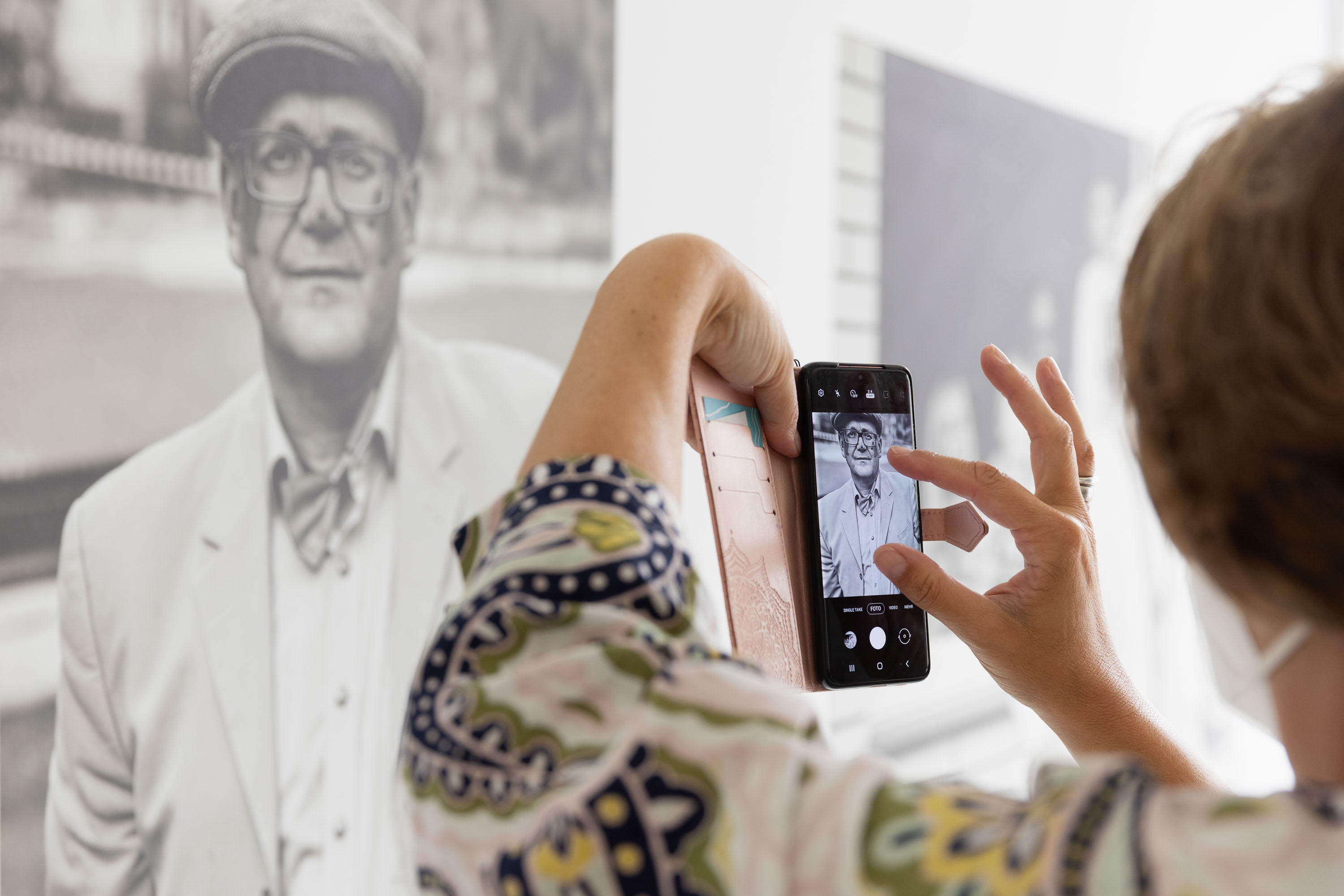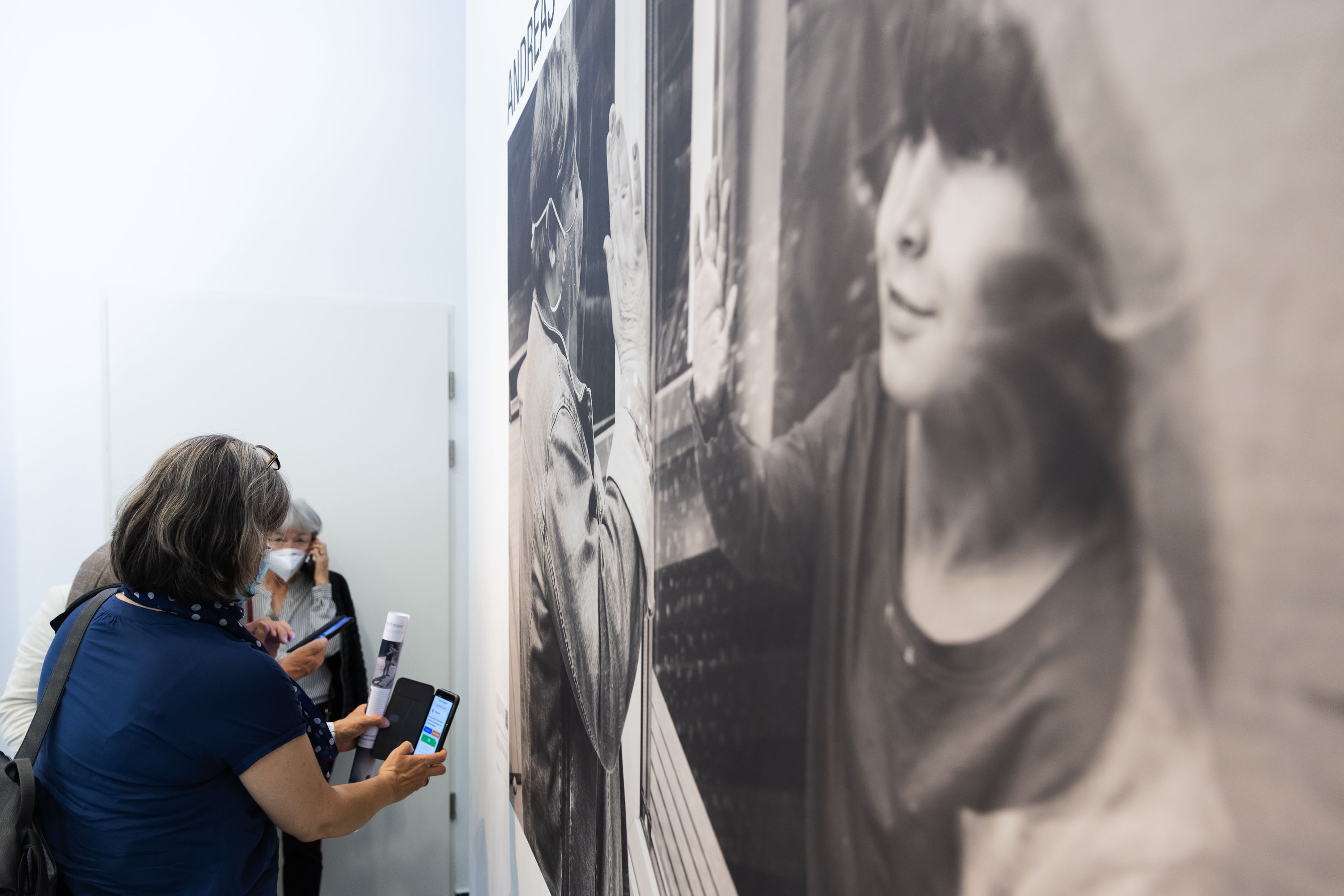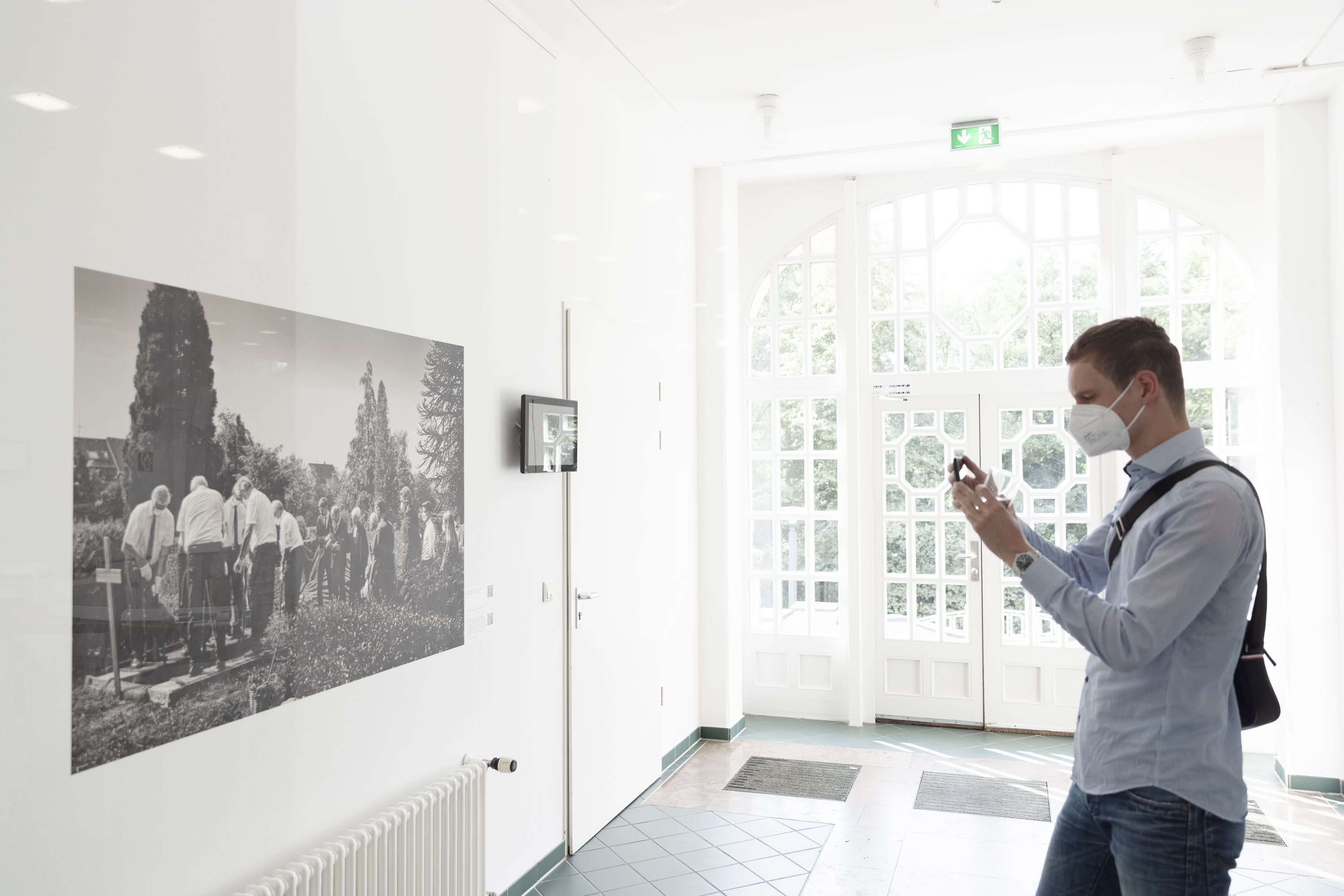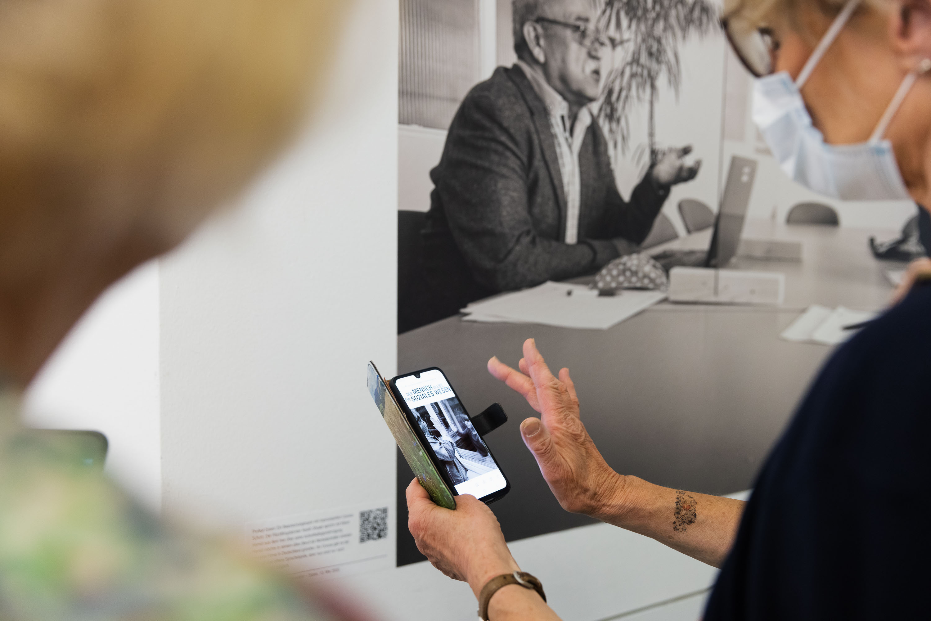 Über QR-Codes können Besucher:innen der Ausstellung Aussagen der Fotografierten anhören