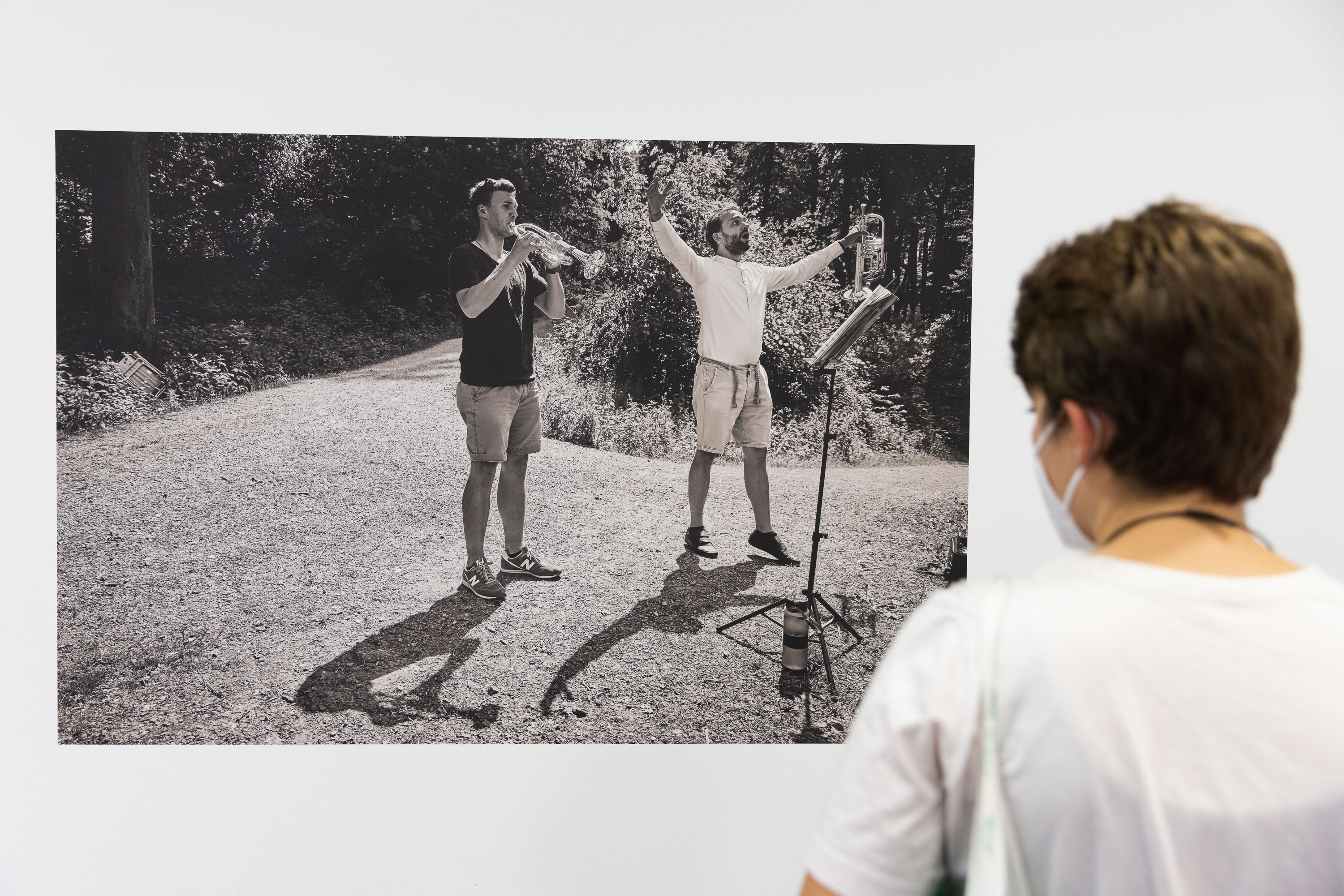 In der Ausstellung gezeigt werden etwa Fotografien von einem mit Corona infizierten Intensivpatienten mit Beatmungsmaske und Schläuchen über dem Brustkorb, von einer Intensivkrankenschwester in Schutzkleidung, von Trauernden auf Abstand bei einer Beerdigung, von einer Erzieherin, die einem Kita-Kind hinter einer Scheibe zuwinkt, von einem Musikstudenten, der mit seinem Trompetenlehrer im Wald übt, weil im Mai 2020 Blasinstrumente in den Räumen der Hochschule nicht gespielt werden dürfen. Viele der Fotografierten waren bei der Eröffnung der Ausstellung dabei, wie der Musikstudent Manuel Galemann, der wegen der Corona-Beschränkungen im Wald üben musste und am Sonntag seine Trompete auf der Terrasse der Wolfsburg unter freiem Himmel spielte.