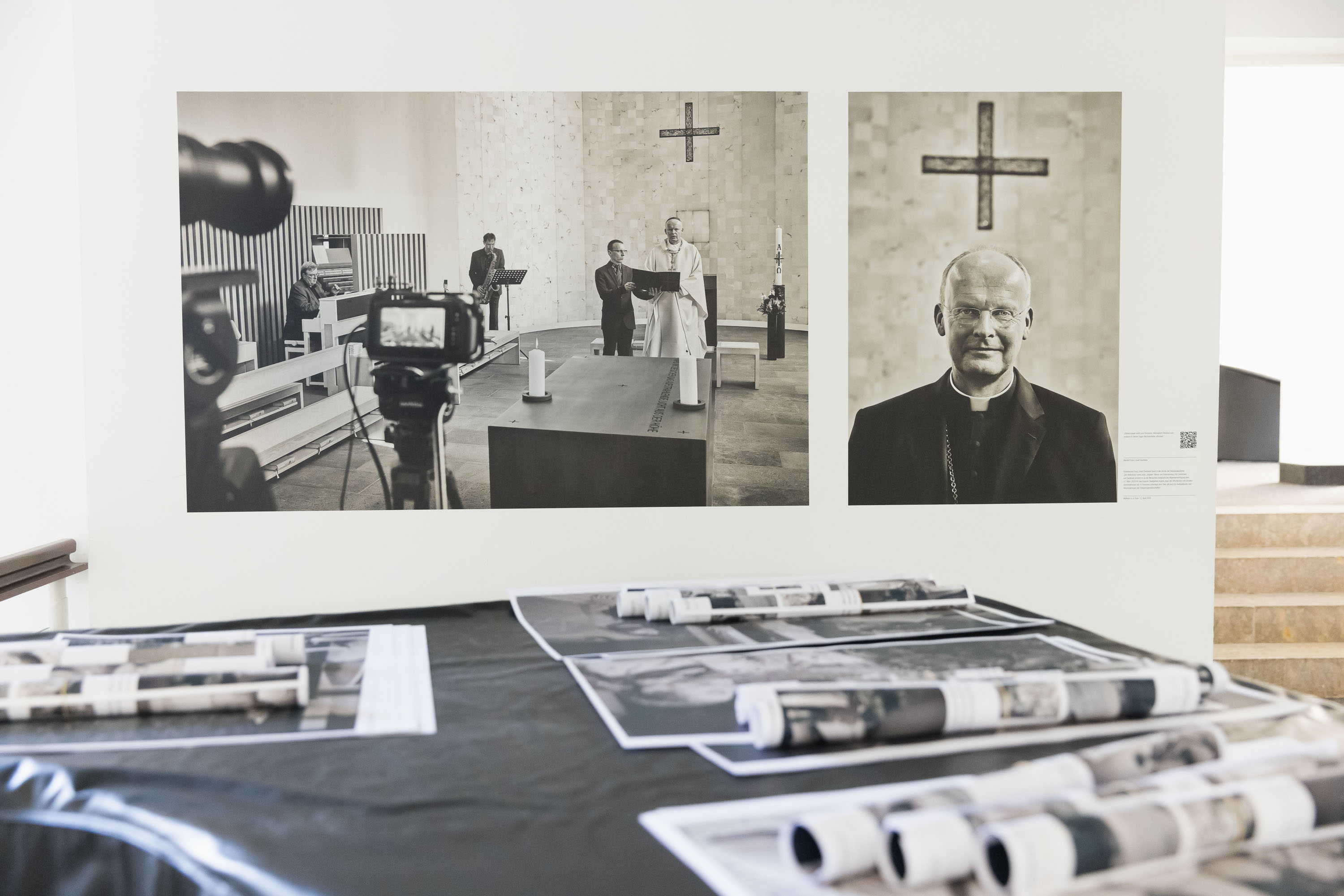 Zu sehen sind auch zwei Fotografien mit dem Essener Bischof Franz-Josef Overbeck. Der Essener Bischof feierte seinen einzigen öffentlichen Gottesdienst am Ostersonntag im April 2020 in der Akademiekirche der Wolfsburg. Die Messe erreichte die Menschen per Livestream. Gottesdienste waren zu der Zeit aufgrund der geltenden Verfügungen untersagt. „Ich halte die Pandemie für eine Prüfung, weil sie uns noch einmal wie in einem Brandbeschleuniger zeigt, in welcher Zeit wir leben und was es bedeutet, dass wir auf eine ungewöhnliche Art, neu mit der Endlichkeit und Vergänglichkeit des Lebens umgehen müssen“, sagt Overbeck in dem Audio-Beitrag.
