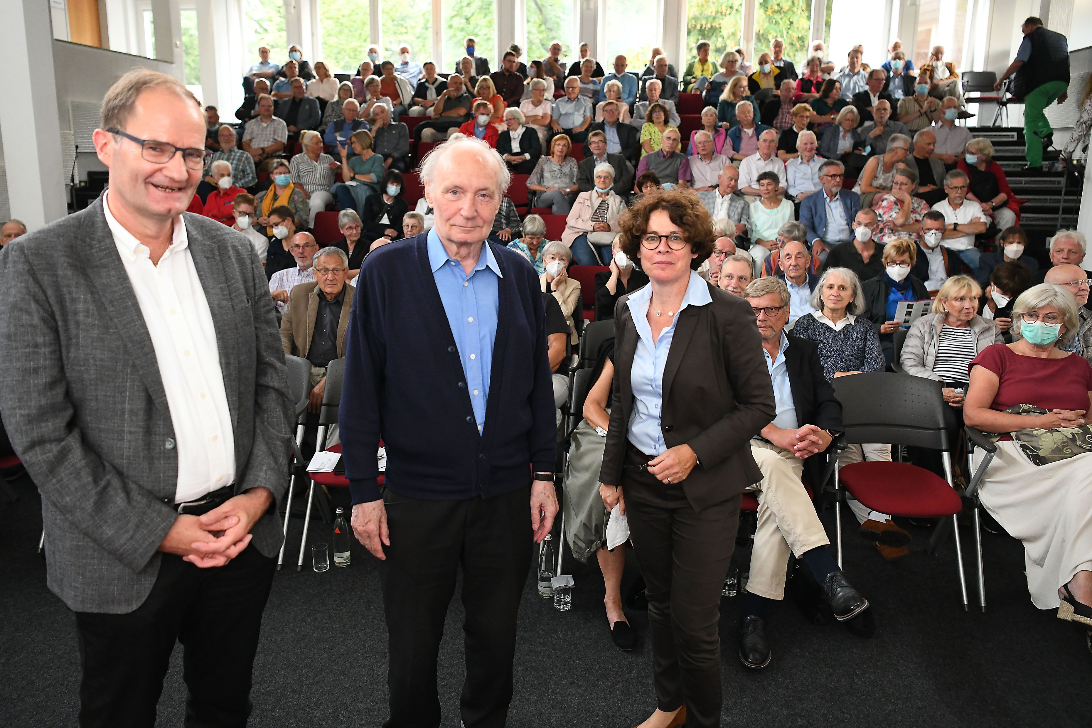 „Es wurde höchste Zeit, dass wir Sie als Gast in unserem Bistum und der Akademie begrüßen dürfen“, sagte Klaus Pfeffer, Generalvikar des Bistums Essen, unter großem Applaus. „Das, was heute so selbstverständlich ist, war früher undenkbar und hätte für große Aufregung gesorgt“, warf der Generalvikar einen Blick zurück in eine Zeit, in der „das freie Wort in der Kirche, eine offene Auseinandersetzung in Glaubensfragen oft schwierig war“. 1991 hatte der damalige Paderborner Erzbischof Joachim Degenhardt dem wortgewaltigen Kirchenrebell Drewermann die Predigt- und Lehrbefugnis entzogen.