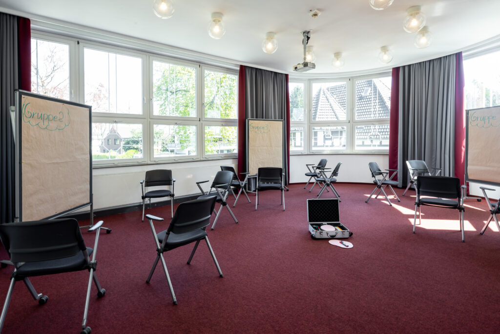 Tageslicht, abdunkelbar, Armlehnstühle, Teppichboden, Projektionswand, Pinnwand, Flipchart inkl. Papier