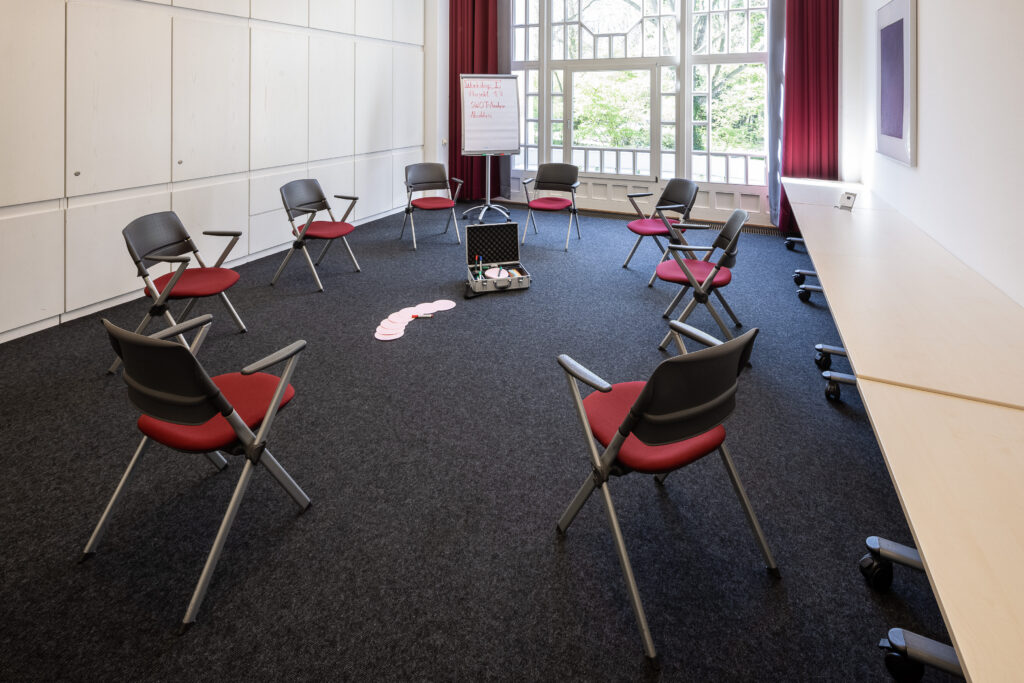 Klimaanlage, Tageslicht, abdunkelbar, Armlehnstühle, Teppichboden, Pinnwand, Flipchart inkl. Papier